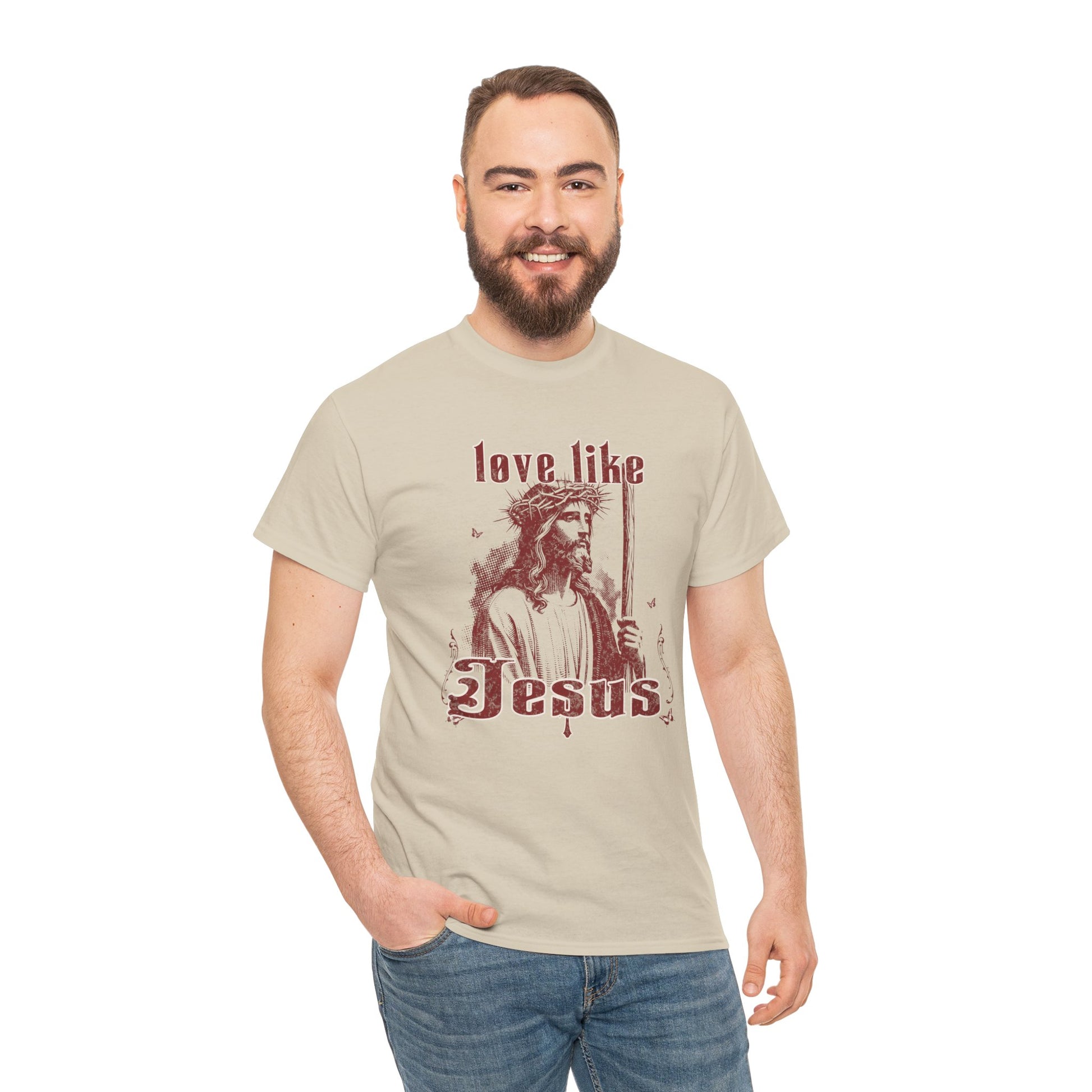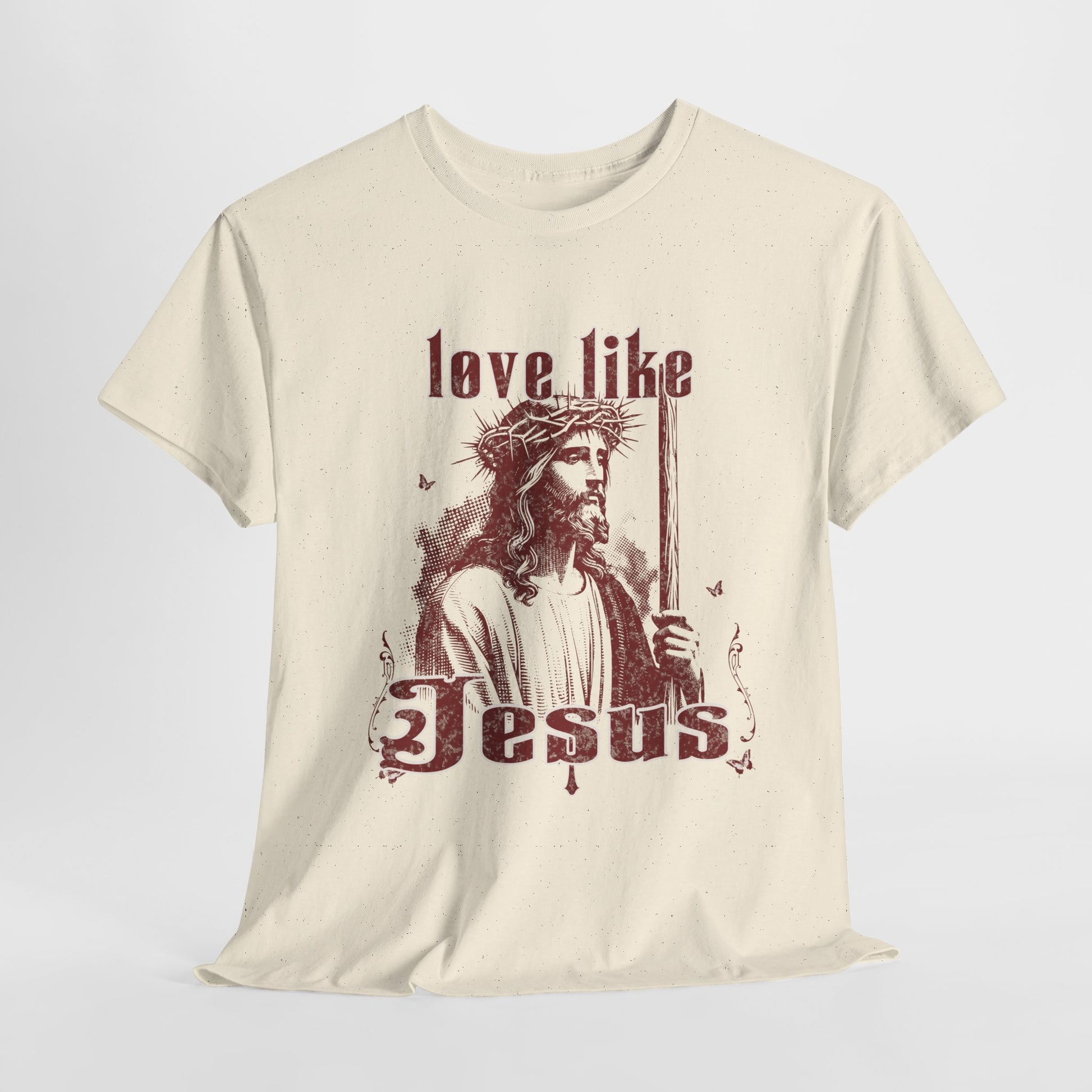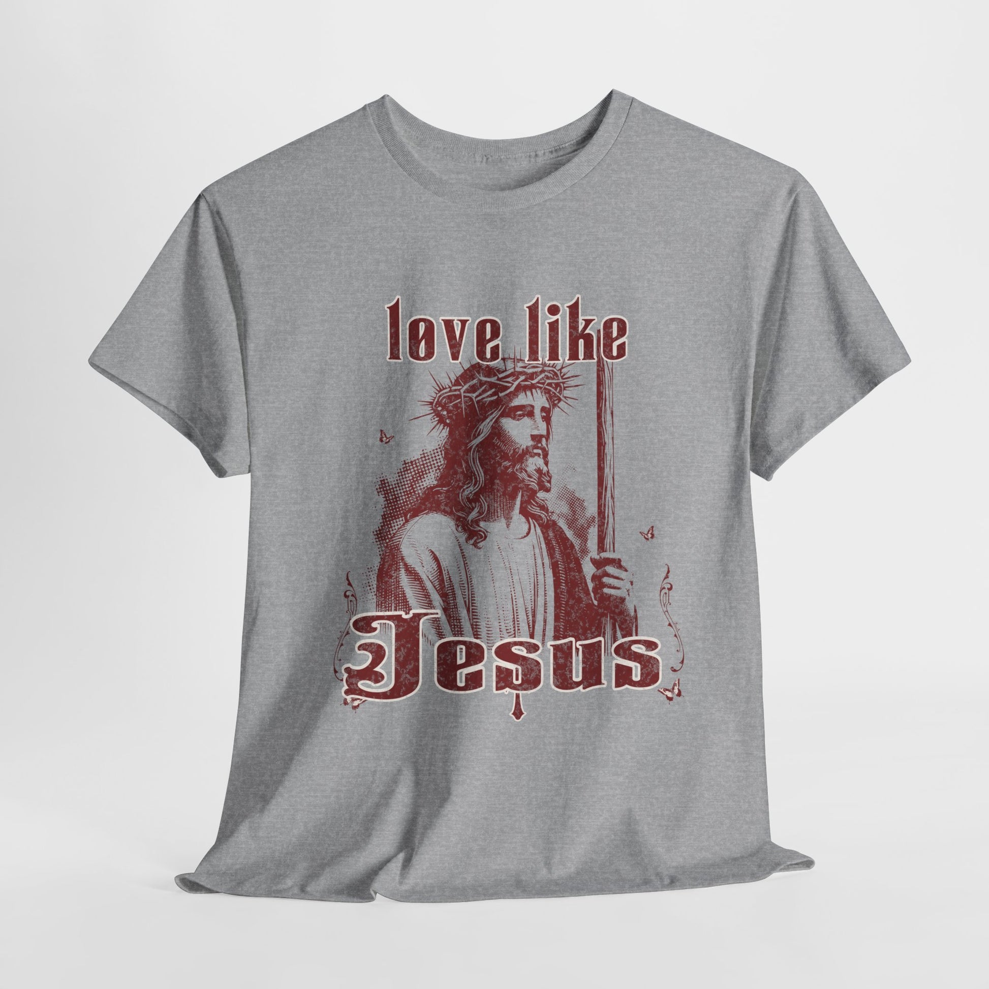 When I slip on this Love Like Jesus t-shirt, I’m not just putting on another tee—I'm putting on a message. The bold red and black design of Jesus with the crown of thorns and staff stops people in their tracks. Above Him, those powerful words Love Like Jesus remind me to live with grace, no matter what’s thrown my way. And that strong gothic “JESUS” across the bottom? It speaks volumes without me saying a word.