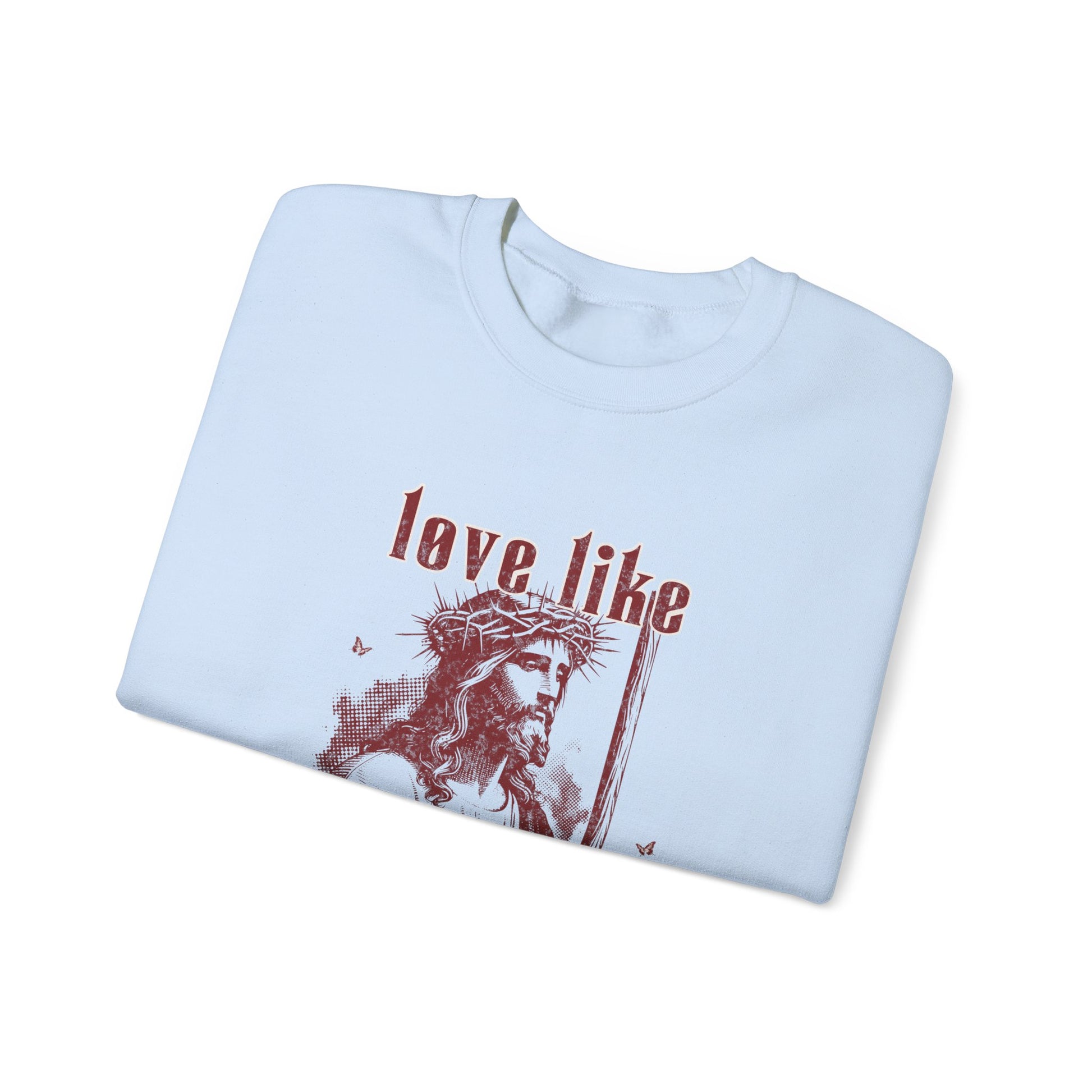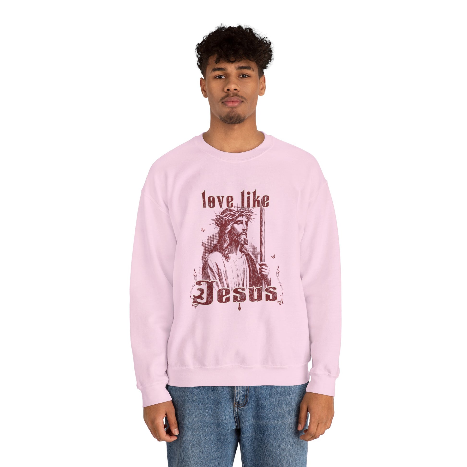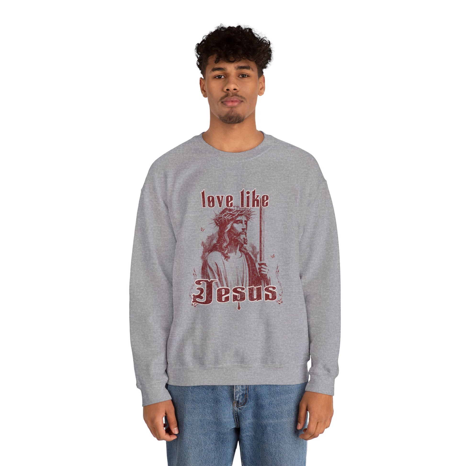Wearing this Love Like Jesus sweatshirt makes me feel grounded and bold at the same time. The deep red and black design of Jesus with the crown of thorns and staff is more than just artwork—it’s a visual statement of truth and strength. Around Jesus, the words 'Love Like' are written in a smooth, expressive font. And the bold JESUS at the bottom? It says what my heart wants the world to know. Love Like Jesus!
