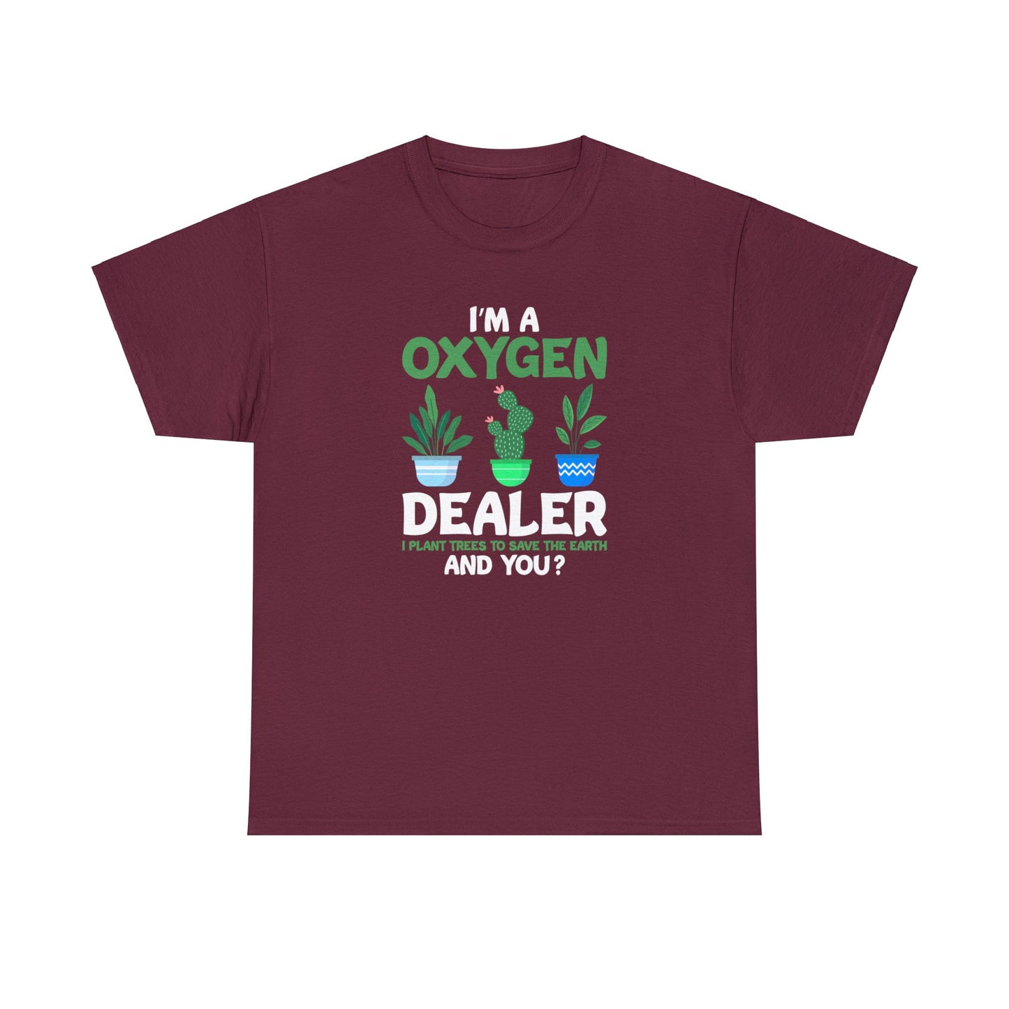 Our "Oxygen Dealer" t-shirt is a bold statement for those dedicated to environmental preservation and tree planting. With the impactful phrase "I'm an Oxygen Dealer. I plant trees to save the earth... and you?" displayed prominently, this shirt is not just a piece of clothing, but a conversation starter and a declaration of your commitment to the planet.